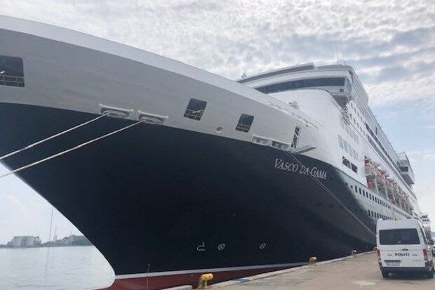 Krydstogtskibet "Vasco Da Gama" anløb en række danske havne i juli. Her København 14. juli, hvor politiet kontrollerede gæsterne. Foto: Danske Havne.