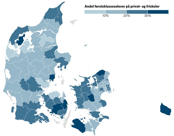 I 40 kommuner går mindst hvert femte barn i 1. klasse på fri- eller privatskole, viser analyse fra Arbejderbevægelsens Erhvervsråd. For 13 år siden gjaldt det kun for 10 kommuner. Det kan få konsekvenser for, hvor godt danske skolebørn klarer sig, viser tidligere studier.