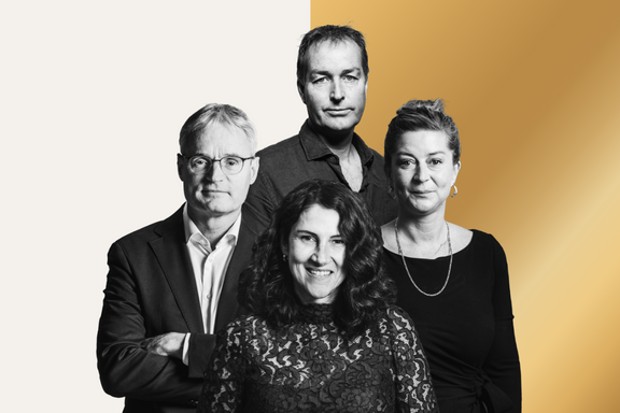 De fire nominerede til Årets Leder 2021 er fra venstre Per Bank, Gitte Aabo, Kasper Hjulmand og Helle Østergaard Kristiansen. Fotos: Christian Als, Lederstof.dk.